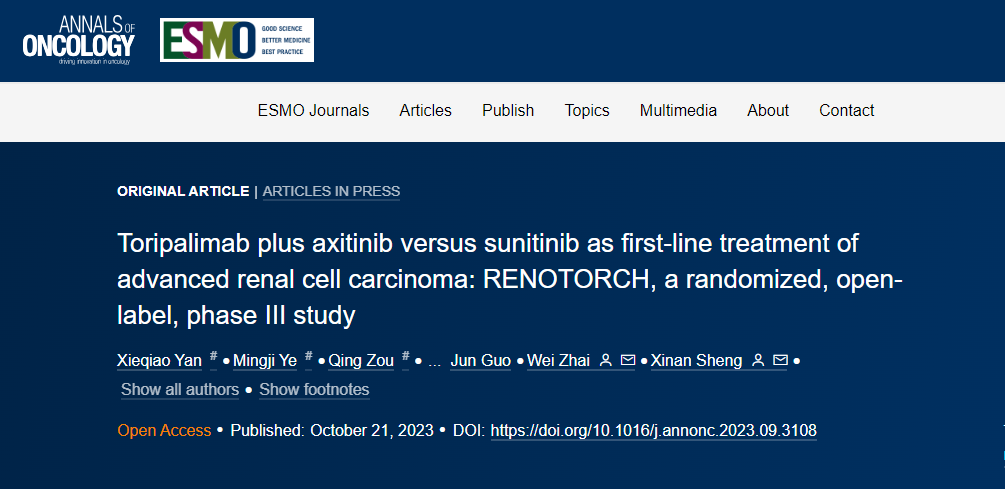 由北京大學腫瘤醫院郭軍教授和上海交通大學醫學院附屬仁濟醫院黃翼然教授聯合牽頭開展的國內首個晚期腎癌免疫治療關鍵Ⅲ期臨床研究RENOTORCH研究成果在ESMO大會優選口頭報告專場會議上首次發佈,北京大學腫瘤醫院盛錫楠教授報告了研究詳細結果。全文同步獲ESMO官方期刊《腫瘤學年鑒》(Annals of Oncology;影響因數:50.5;腫瘤領域全球排名TOP5的頂級期刊)發表,吸引了國際學者的廣泛關注。